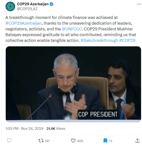 The gavel came down after an agreement was finally found this week following two weeks of negotiations at the 29th United Nations Climate Change Conference, the Conference of the Parties of the UN Framework Convention on Climate Change, COP 29, in Baku, Azerbaijan, a petrostate.